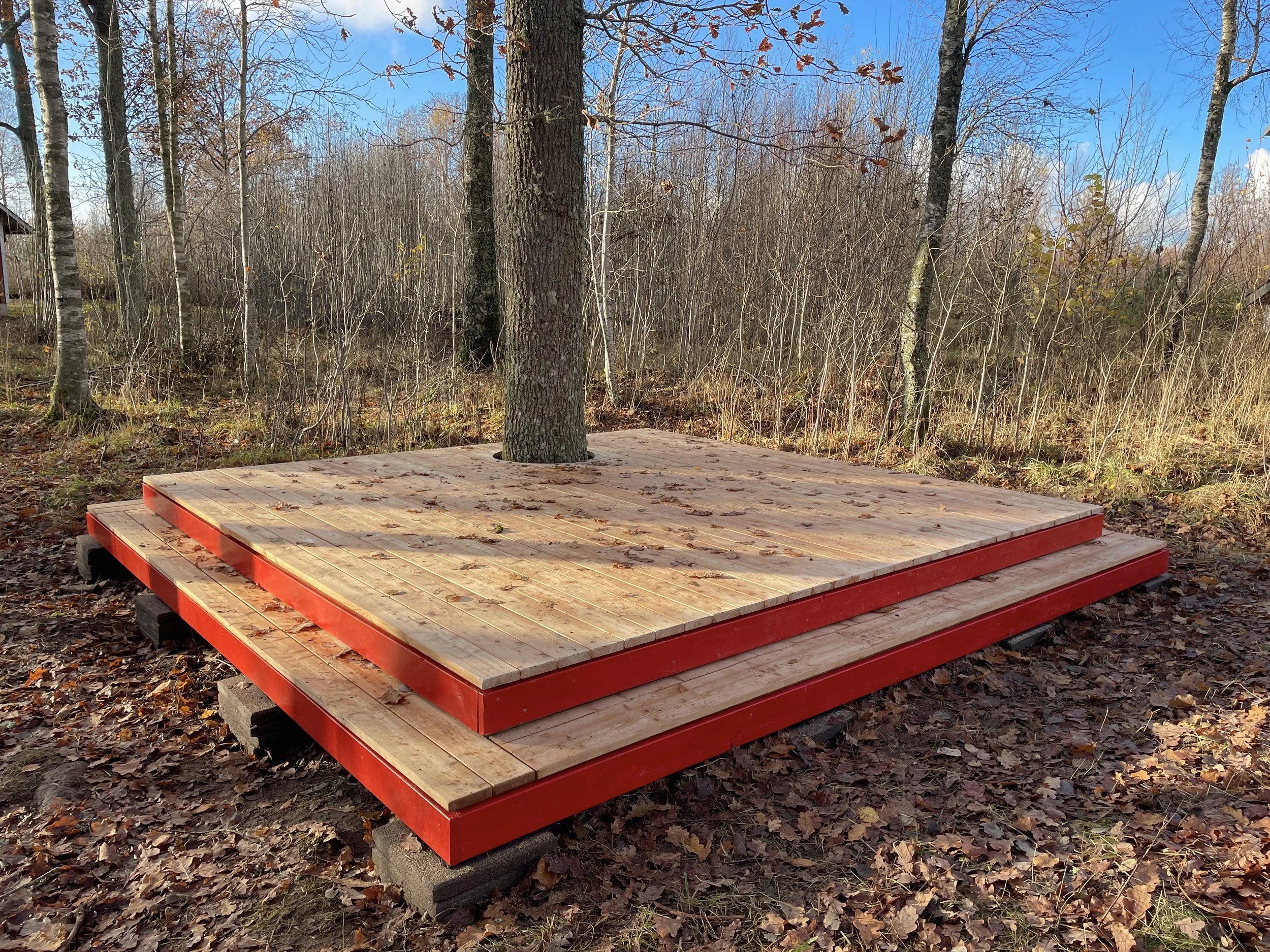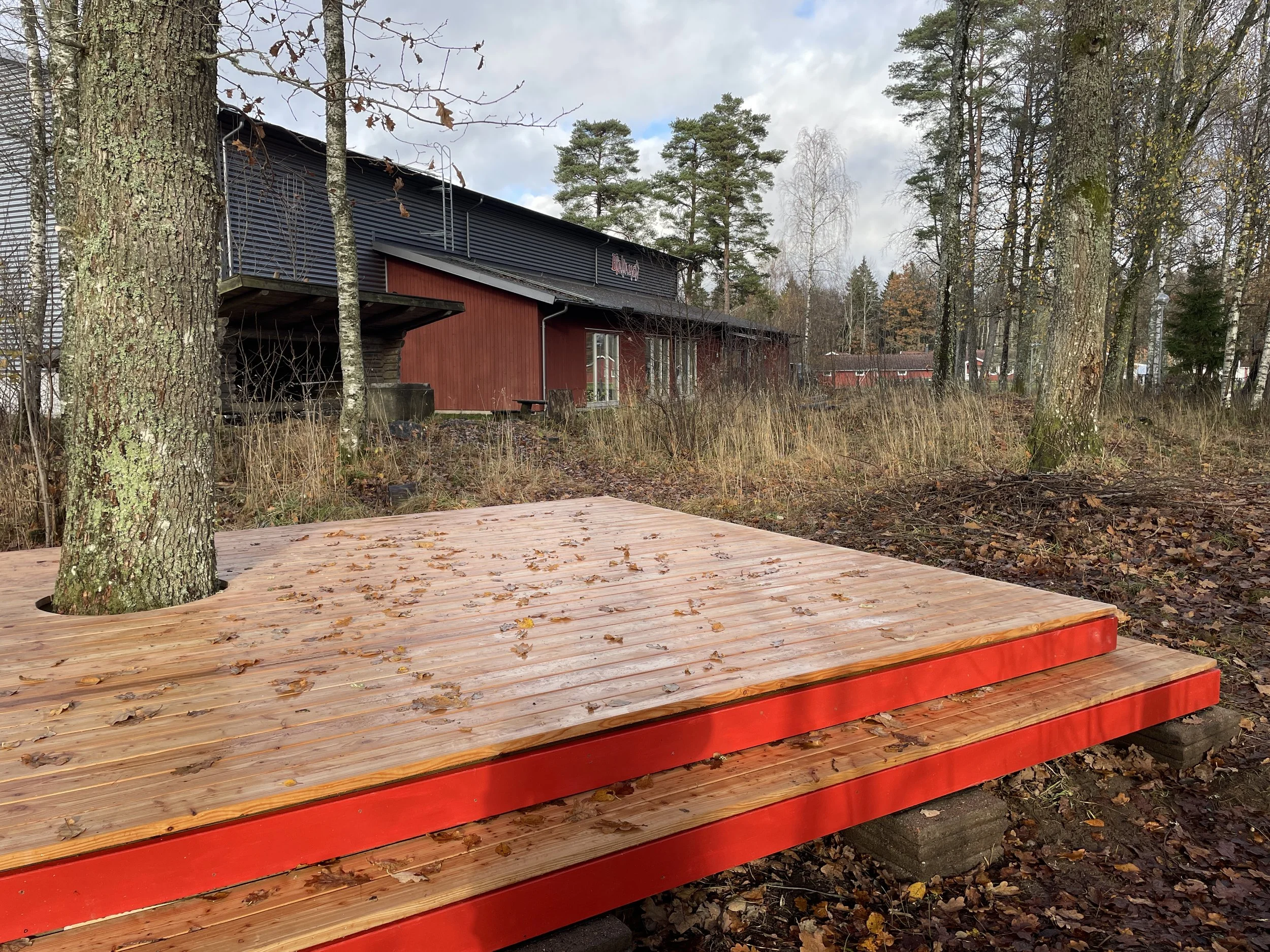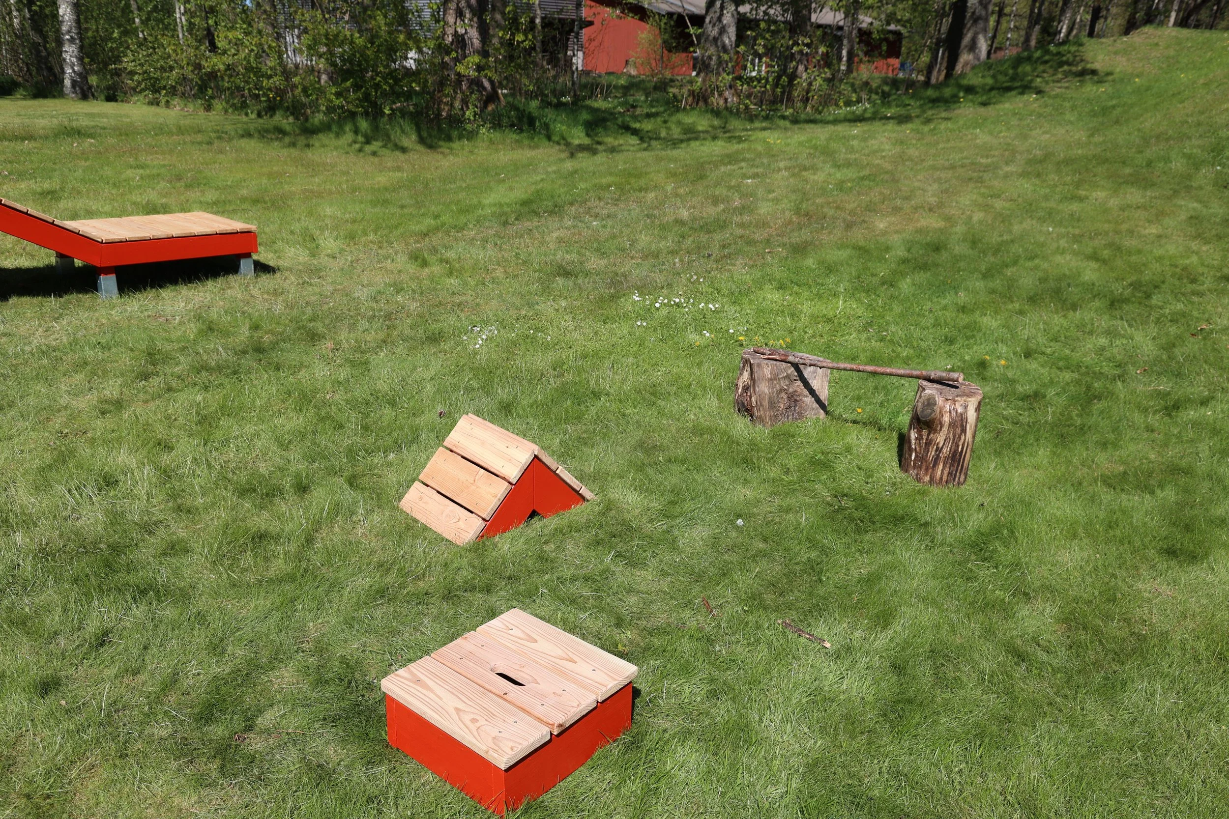 Skojparken is the design outcome of interactions with the children. It consists of four fixed objects, six smaller loose objects, and a deck.